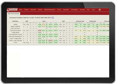 In real-time, users can view their tons per hour by crew or by truck, feet per minute, cycle time, trucking cost per ton (TCpT) and more. Color coding shows at-a-glance what metrics need corrective action, as KPIs are automatically measured against estimated benchmarks. Metrics shaded in green are meeting their targets, yellow shading indicates those to monitor and red shading shows underperformance.