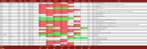 For example, if you take a look at the fuel summary report below you will see columns that list the number of gallons of fuel that have been used for each piece of equipment every day. The green represents the fuel usage that occurred when the excavators were being productive, and the red represents fuel burn when the excavators were idling during the job. In other words, the red bars show which excavators had unproductive fuel burn for the day.